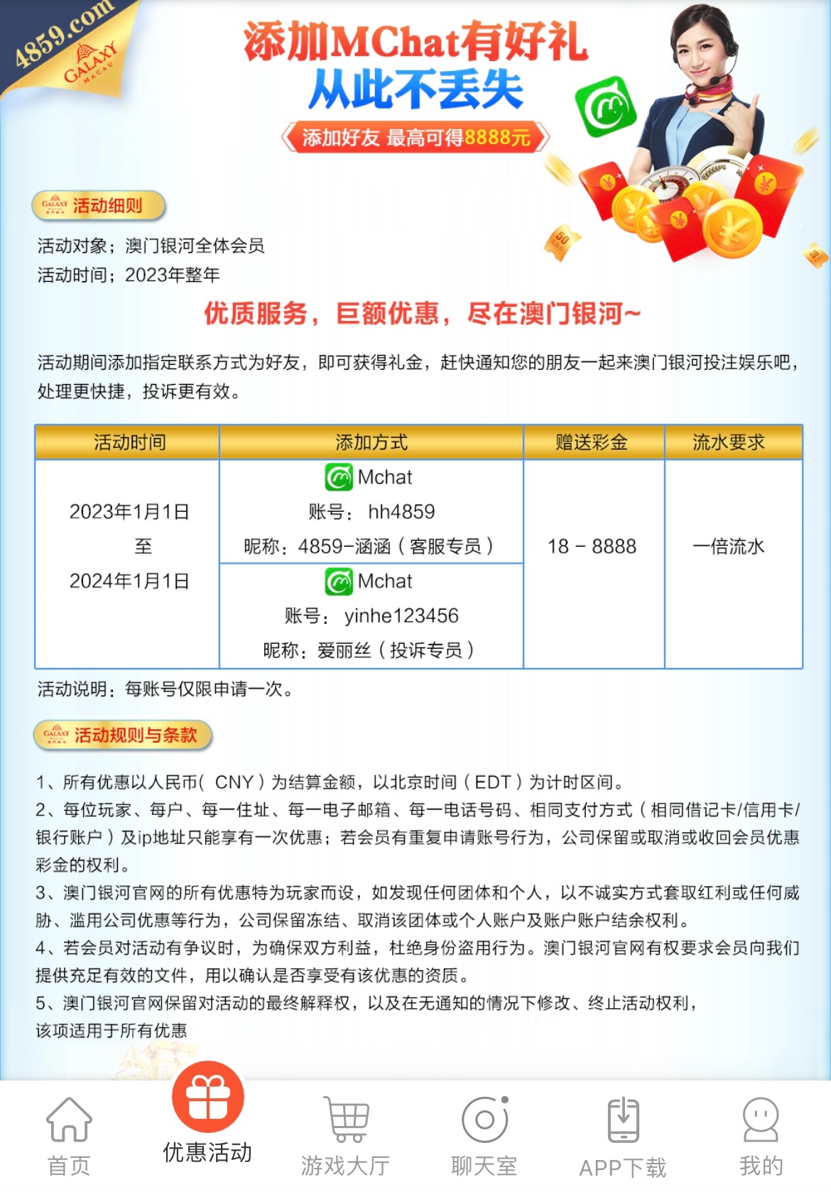 新用户注册完善个人信息 下载mchat加客服最低送18 一倍流水