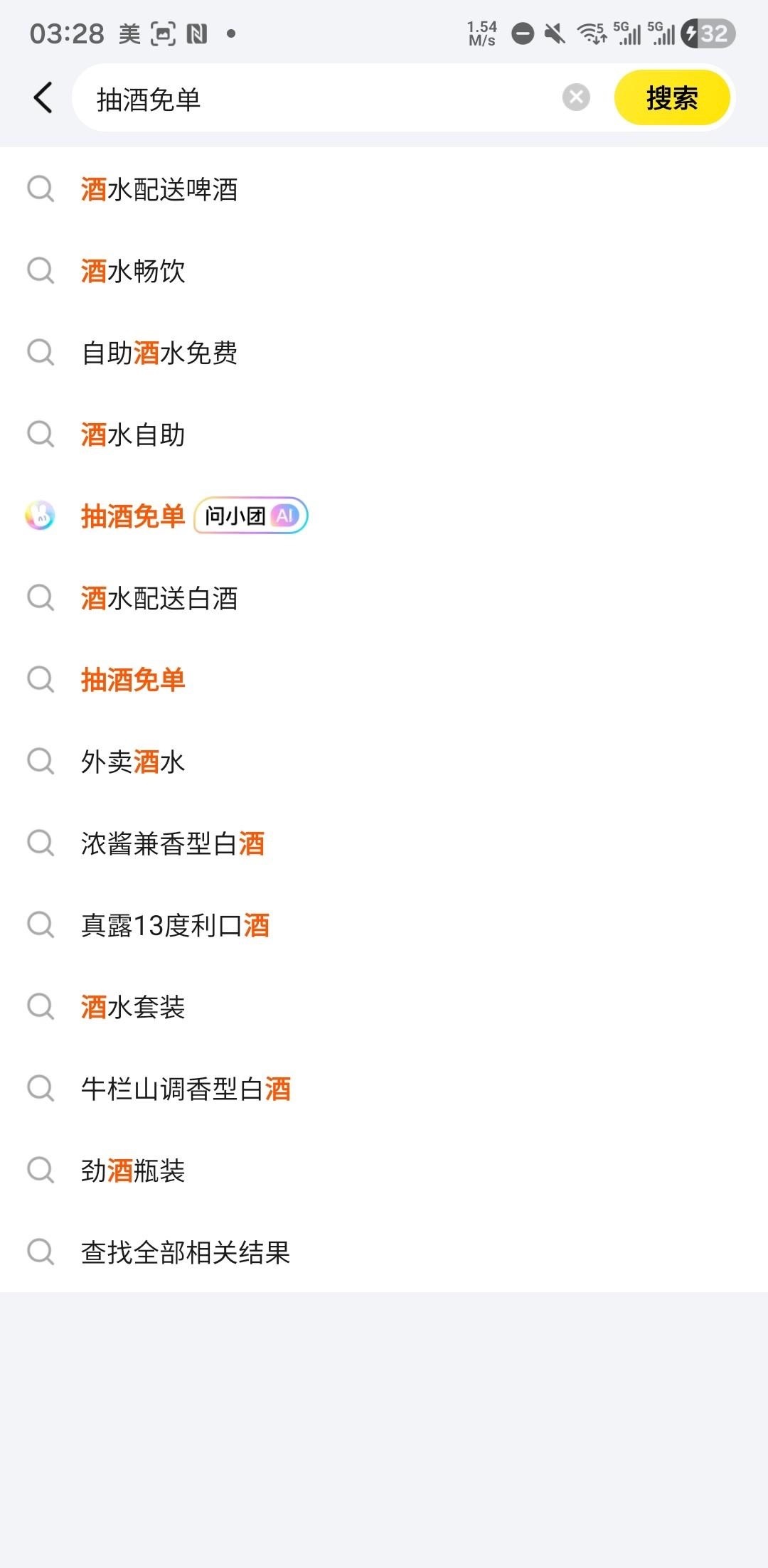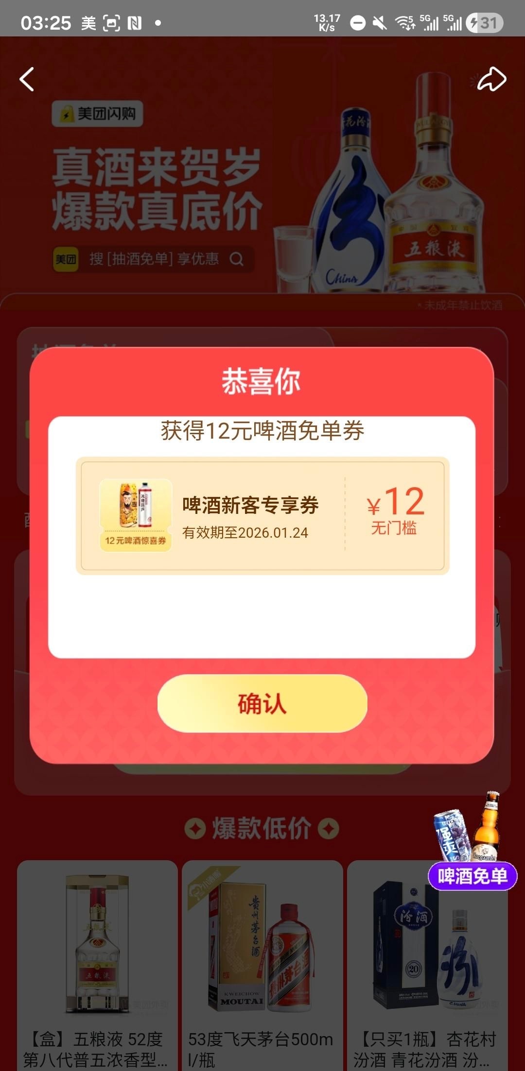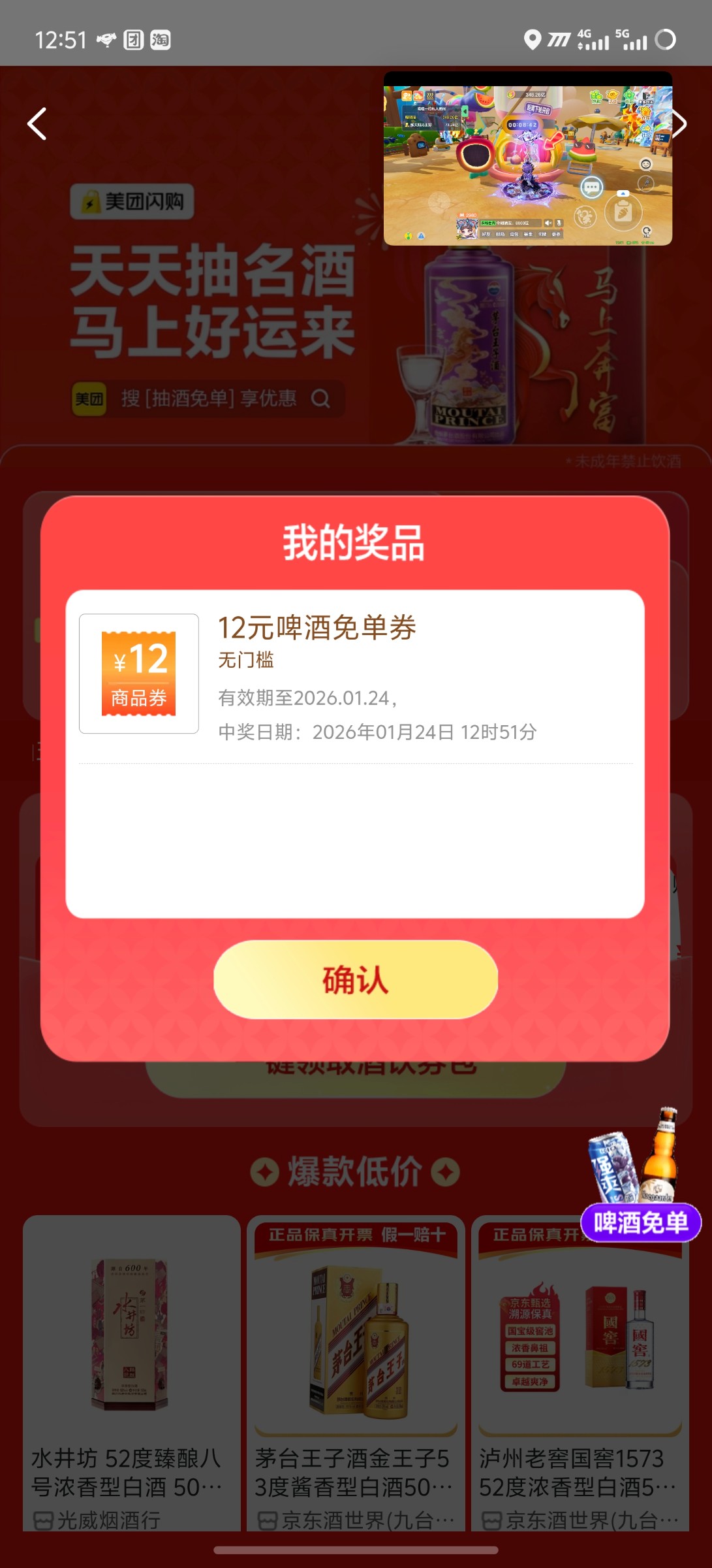 美团app首页搜索抽酒免单进入活动界面,有无限次的机会,可以中五粮液,基本都是12减12,可以半夜渴了买点啤酒喝解解渴。