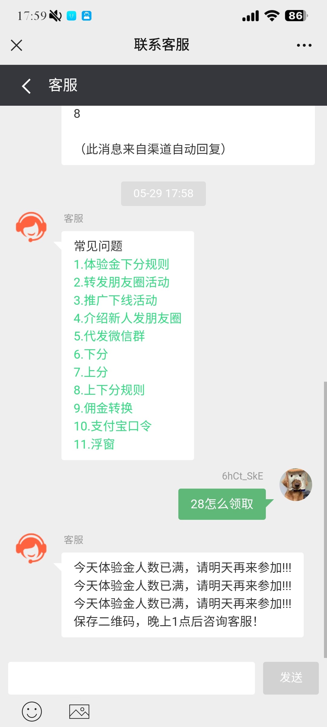 微信扫码进入今天没有名额了等今晚1点后找客服申请28打到238出28 打到388出38