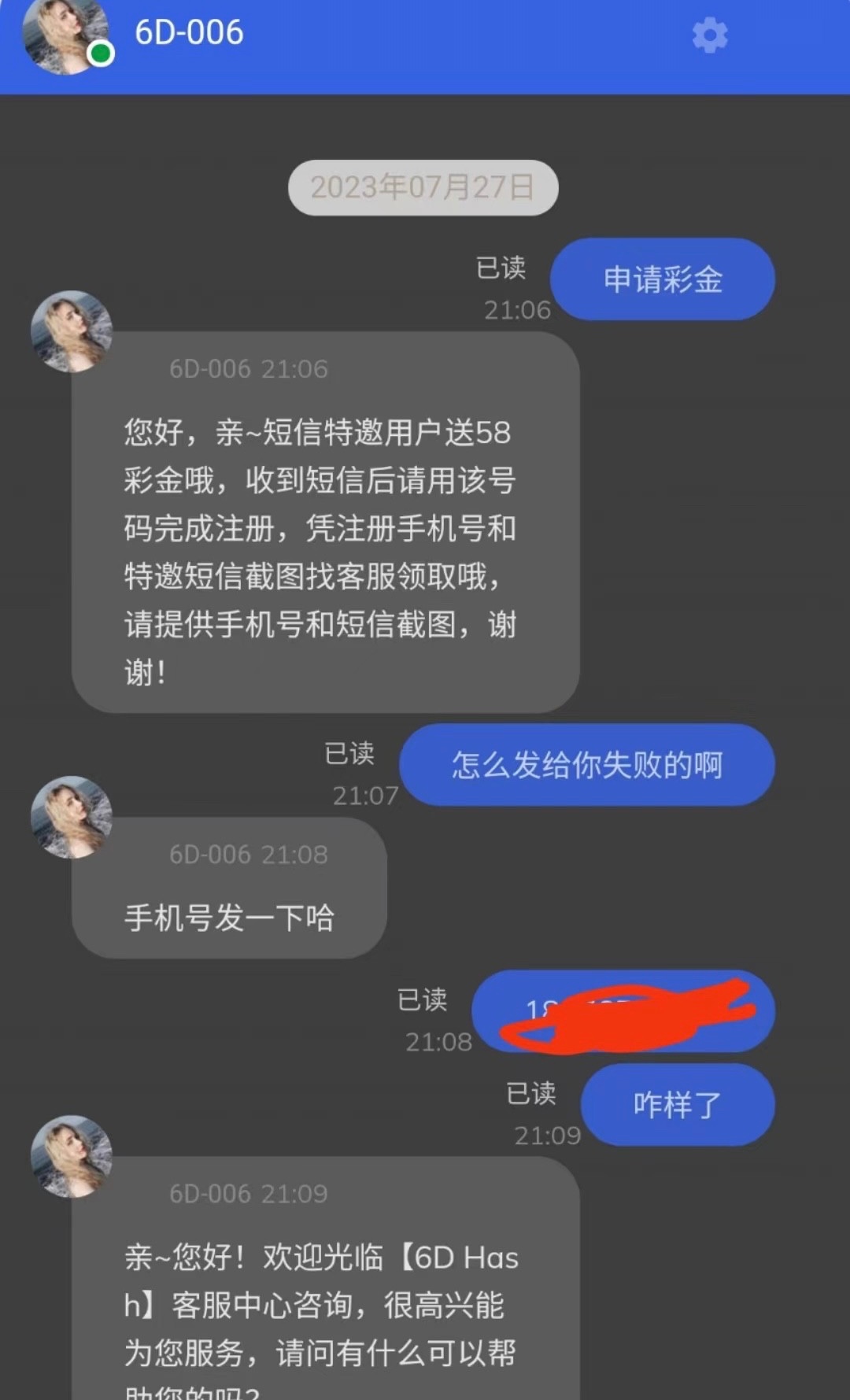 新用户注册绑卡 联系客服申请短信特邀彩金 下方短信图 特邀碰瓷