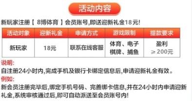 新用户注册绑卡送18彩金 限制游玩体育电子捕鱼棋牌 最低提款100元 没送的等10分钟左右自动送